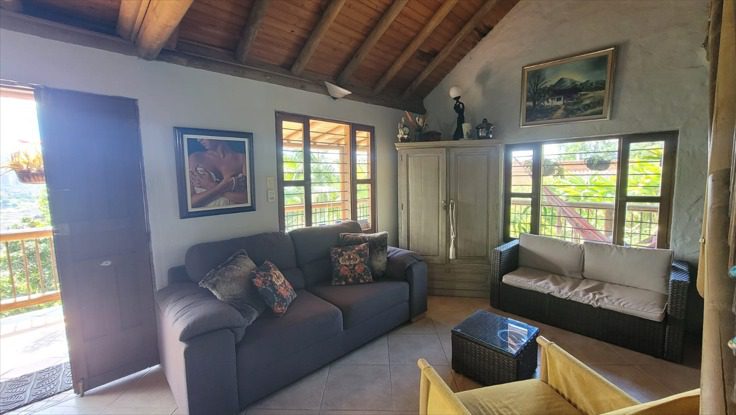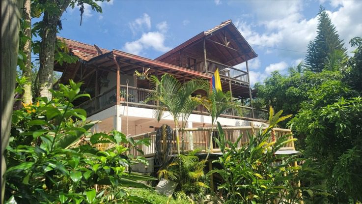 The main house includes three bedrooms and three bathrooms, complemented by a large balcony that offers scenic views of the surrounding greenery.