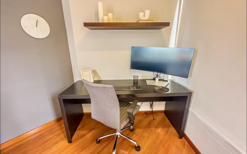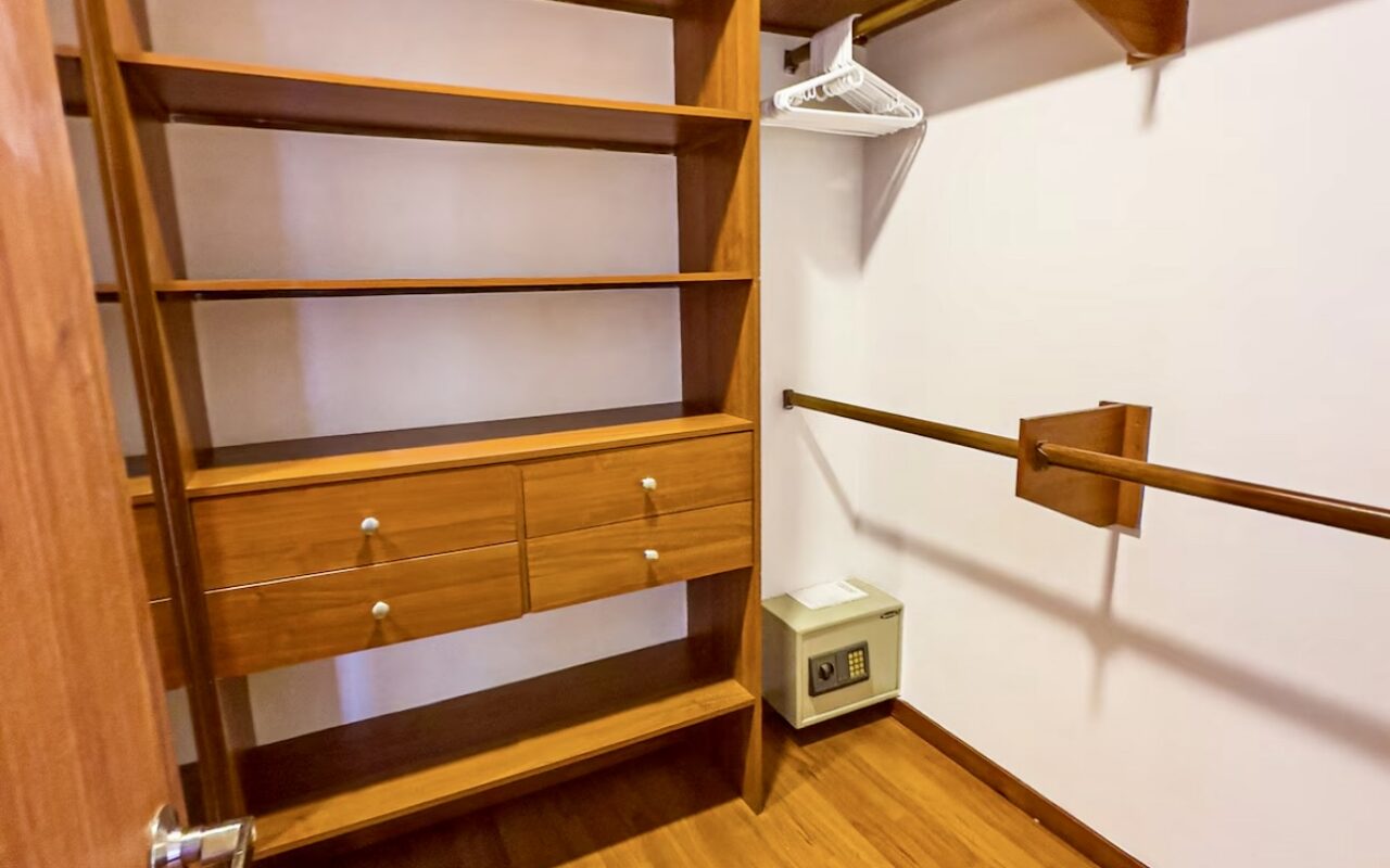 The unit includes a maid’s quarters and is located in a building with twenty-four hour security and an elevator.