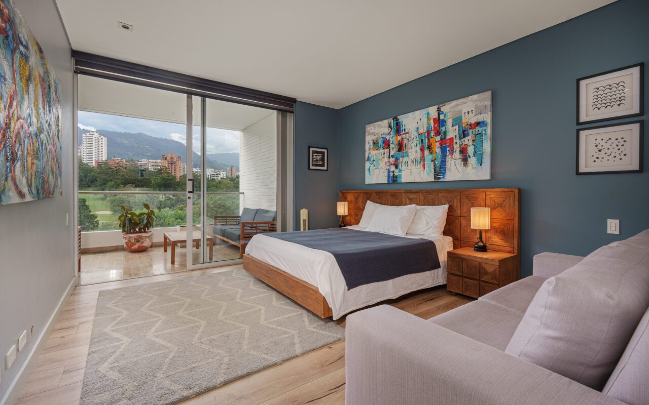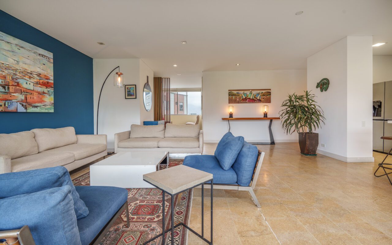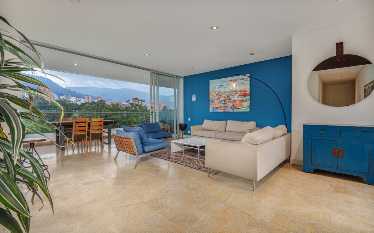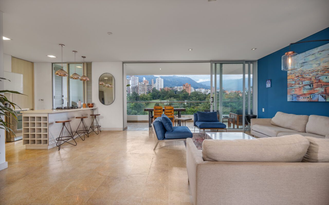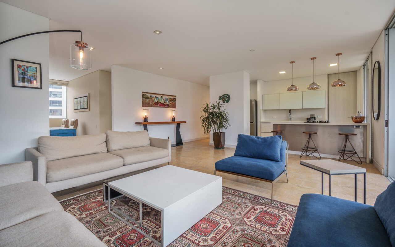 This stylish and quiet apartment is located in the Club Campestre sector of El Poblado, situated on a quiet cul-de-sac with no street noise and within walking distance of the Santa Fe Mall.